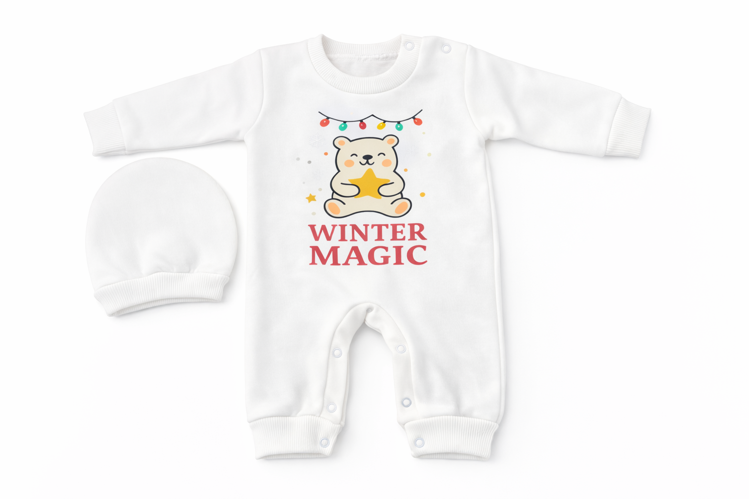This adorable baby outfit features a soft, warm salopette decorated with a cute winter bear holding a star, surrounded by festive lights — the perfect design for newborns during the colder season.
