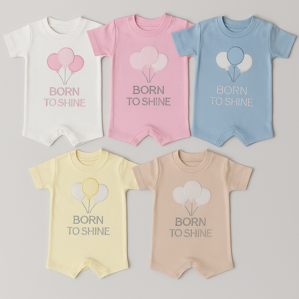 Celebrate your baby’s brightness with our Born to Shine Baby Bodysuit, crafted from premium 100% soft cotton for gentle comfort and breathability. Featuring a playful trio of embroidered balloons and the uplifting message "Born to Shine," this romper brings joyful vibes to your little one’s wardrobe.