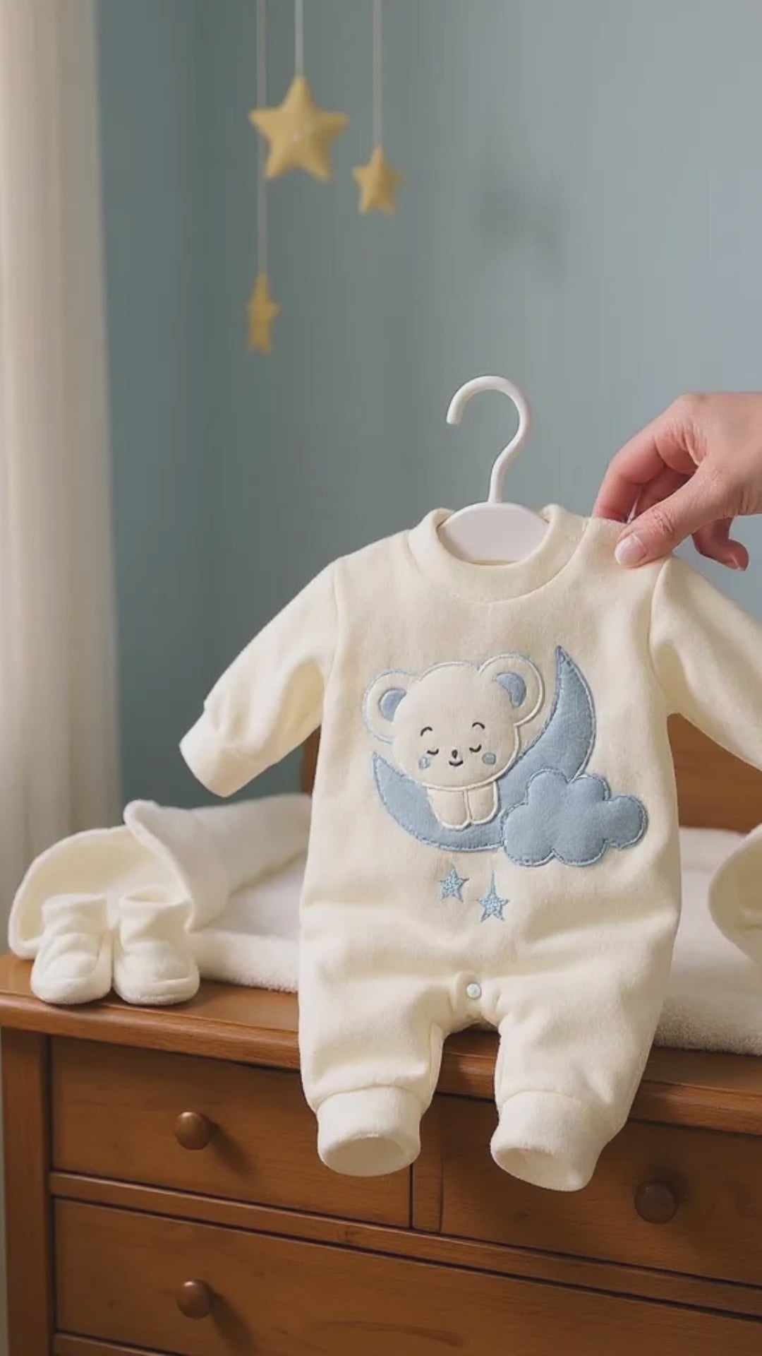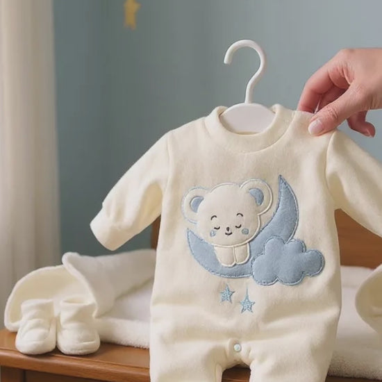 Dress your little princess in dreamy comfort with the Moon Bear Baby Matching Suit – Girl. This 4-piece newborn set includes a soft footed romper, matching hat, cozy booties, and a warm blanket – all designed to keep your baby girl snug and stylish. Made from gentle, breathable fabric that feels soft on delicate skin, this set features adorable moon and bear embroidery with star details for a picture-perfect bedtime look.