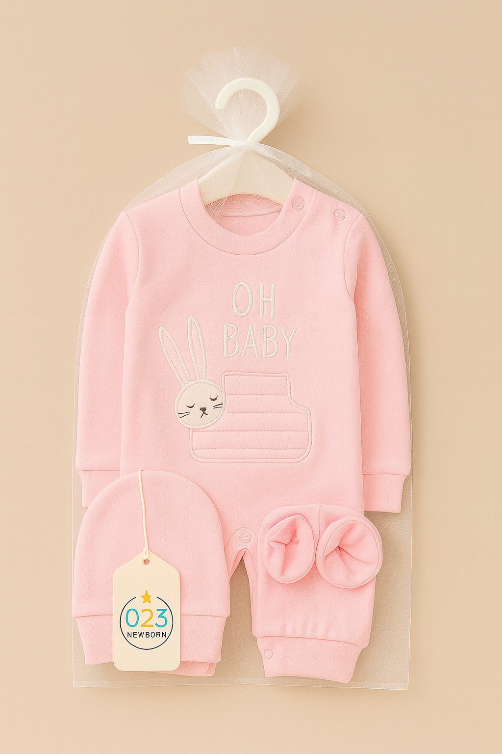 Soft, sweet, and irresistibly cute — the “Oh Baby Bunny” 3-Piece Baby Outfit Set from 023 Baby Wear is the perfect cozy companion for your little one’s first moments.