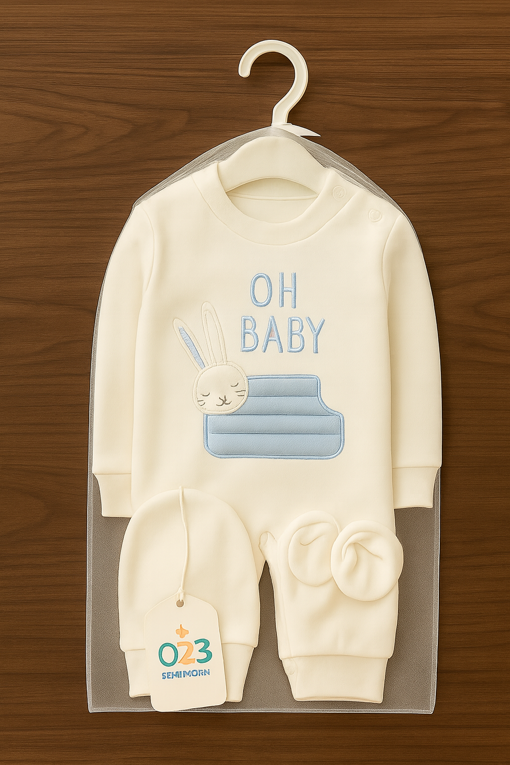 Soft, sweet, and irresistibly cute — the “Oh Baby Bunny” 3-Piece Baby Outfit Set from 023 Baby Wear is the perfect cozy companion for your little one’s first moments.