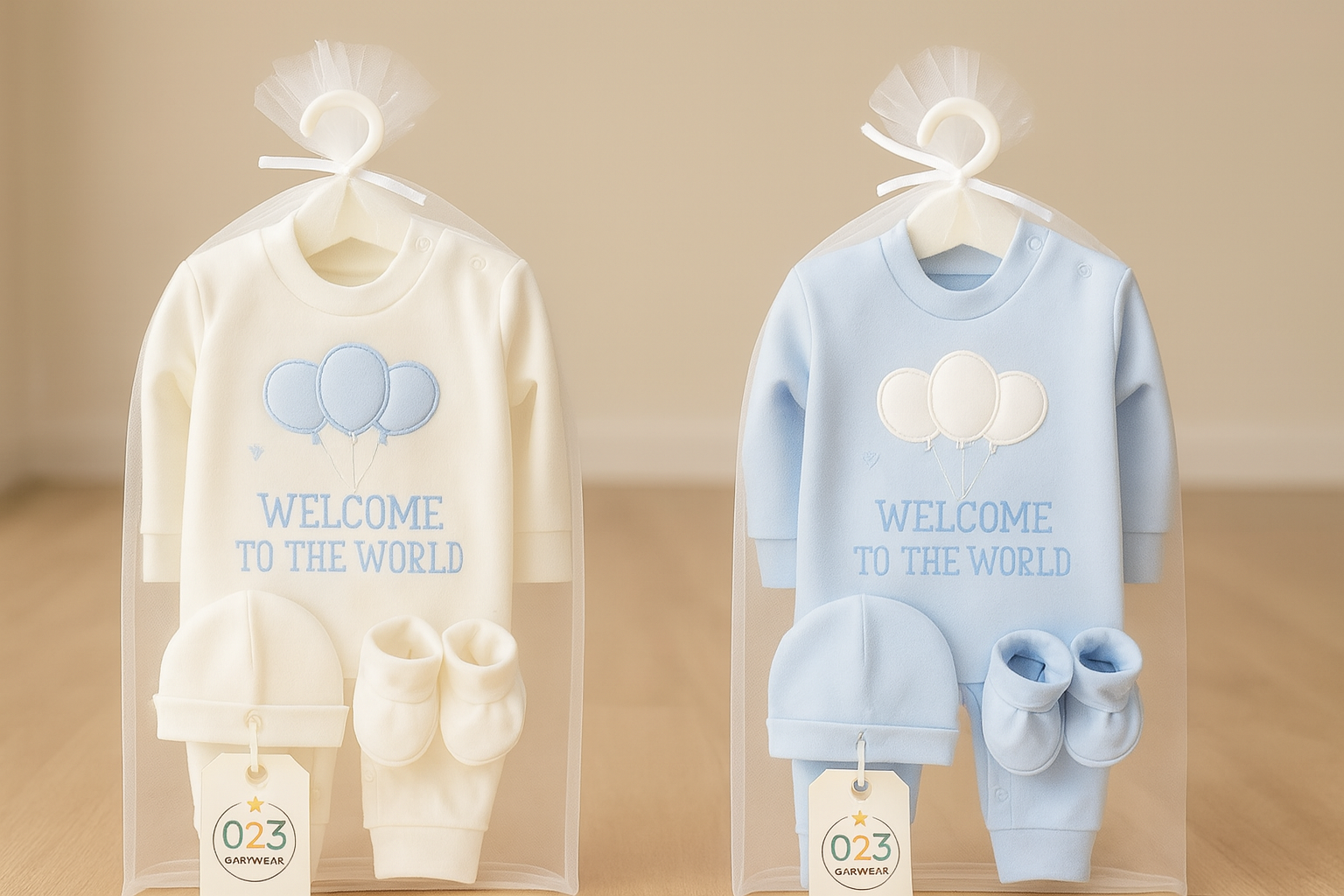 Celebrate your baby’s first days with the soft elegance of our “Welcome Balloon” 3-Piece Newborn Baby Outfit Set from 023 Baby Wear.